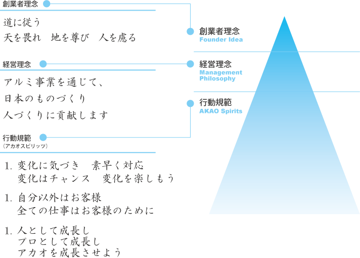 一方で、アルミ市場は利用分野や海外企業との競争など、事業環境が大きく変化しています。私たちは、常にその変化を捉えてアカオアルミの価値をお客様や社会に提供し続けていきます。その中でひとりひとりが人として成長していくことを、アカオスピリッツとして定めています。このアカオスピリッツはまた、創業者である赤尾四郎の創業者理念を表したものでもあります。